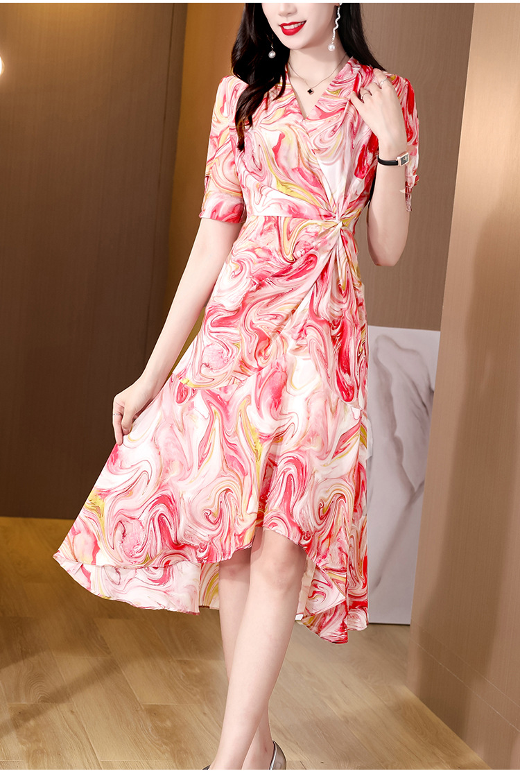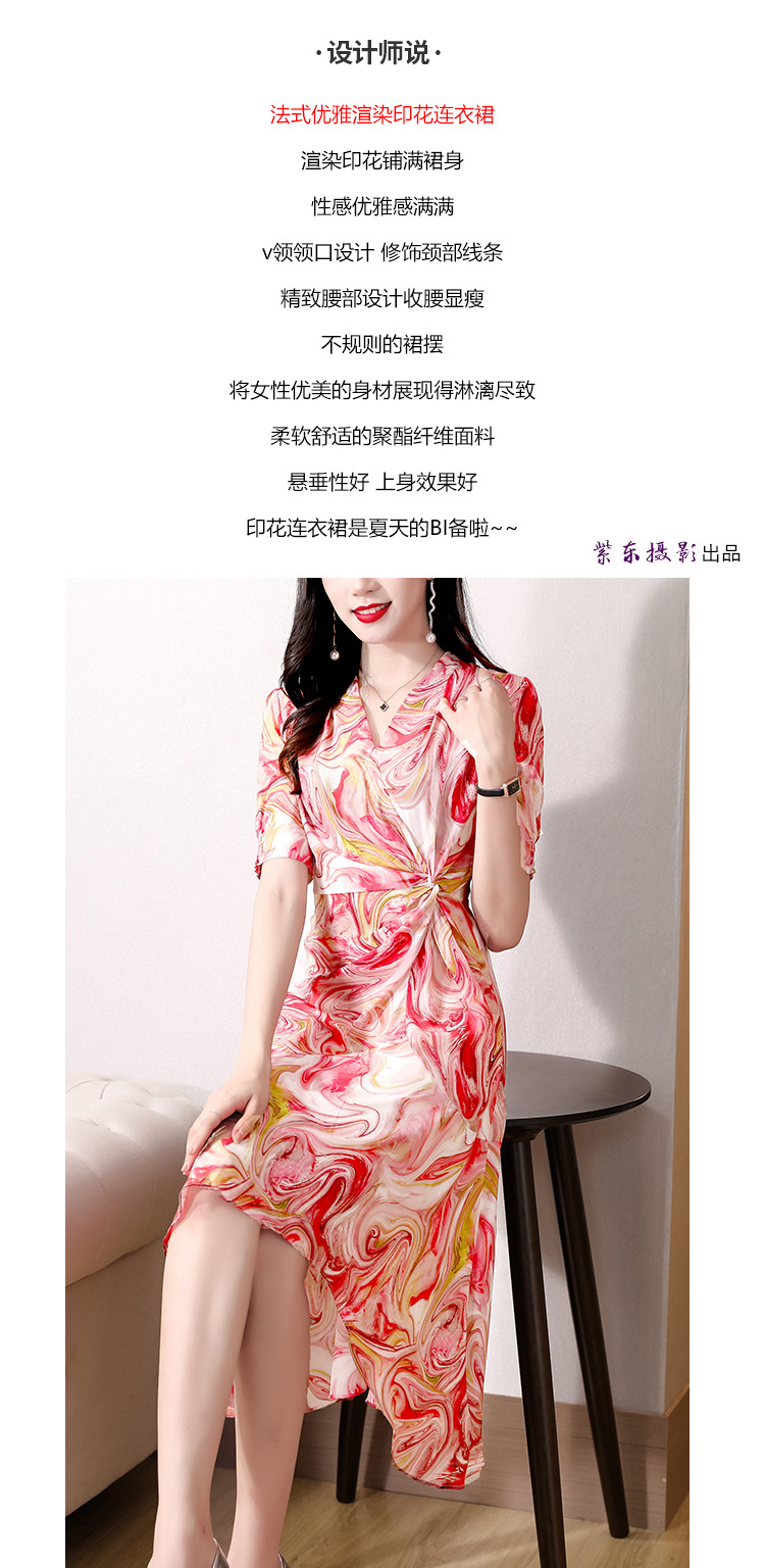 緞面絲連衣裙女夏季V領設計感收腰顯瘦印花桑蠶絲長裙子女裝