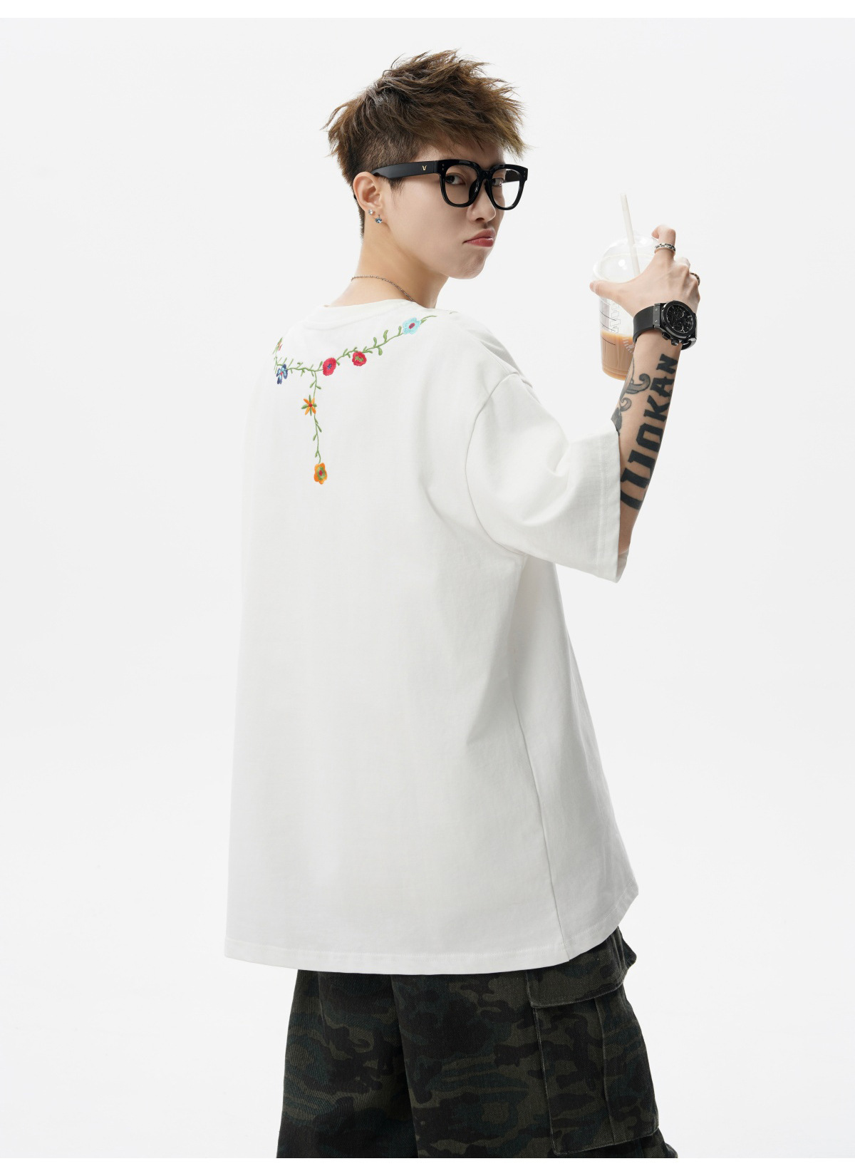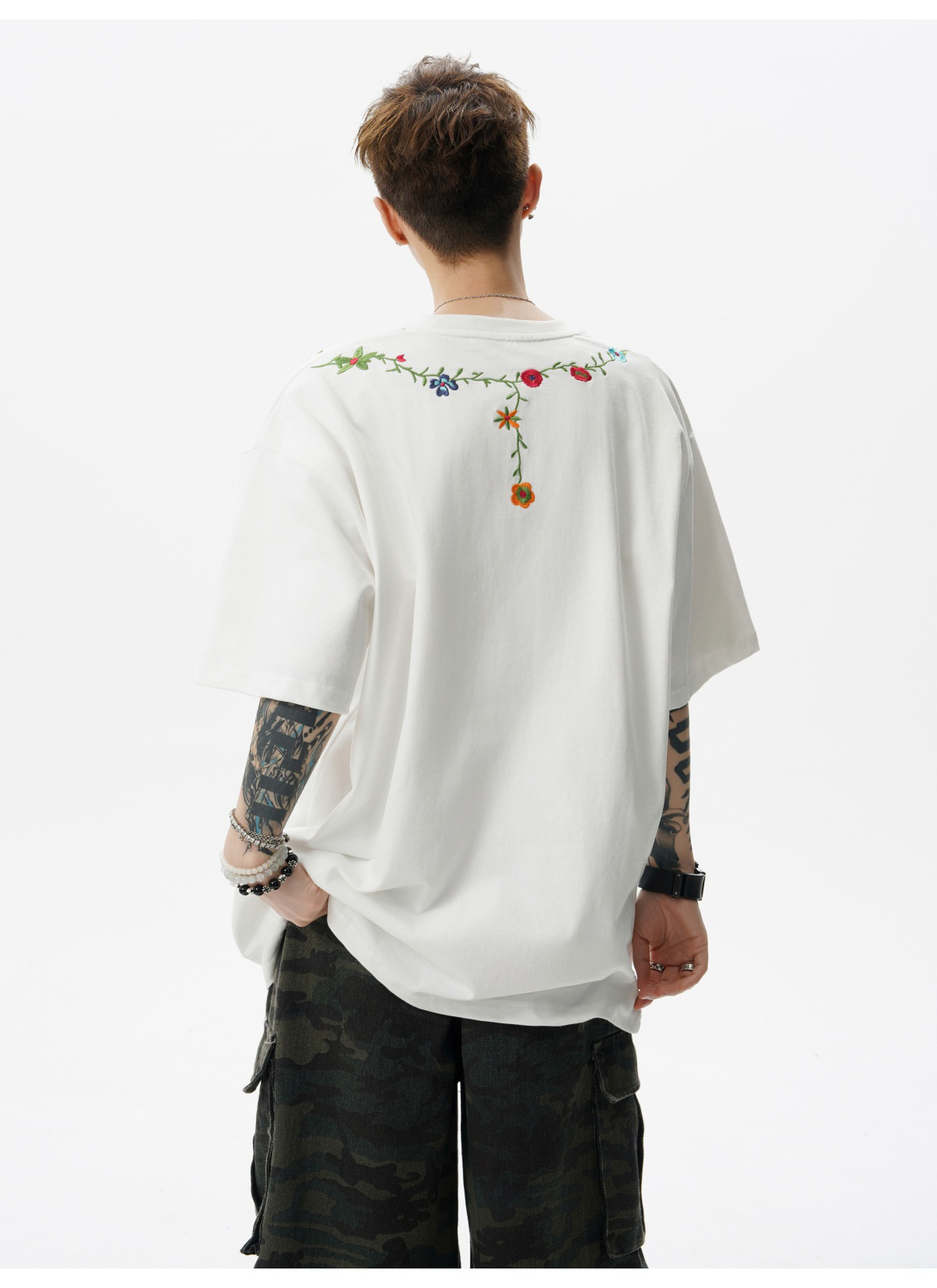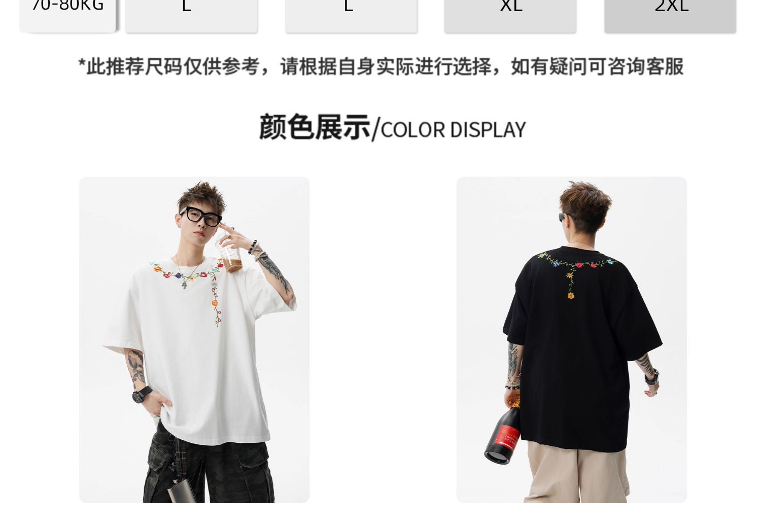 國潮花卉刺繡短袖T恤男夏季美式寬松情侶五分袖高街痞帥圓領上衣