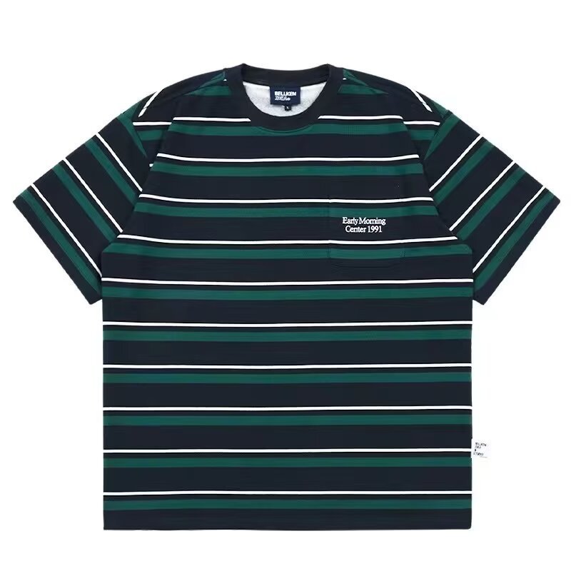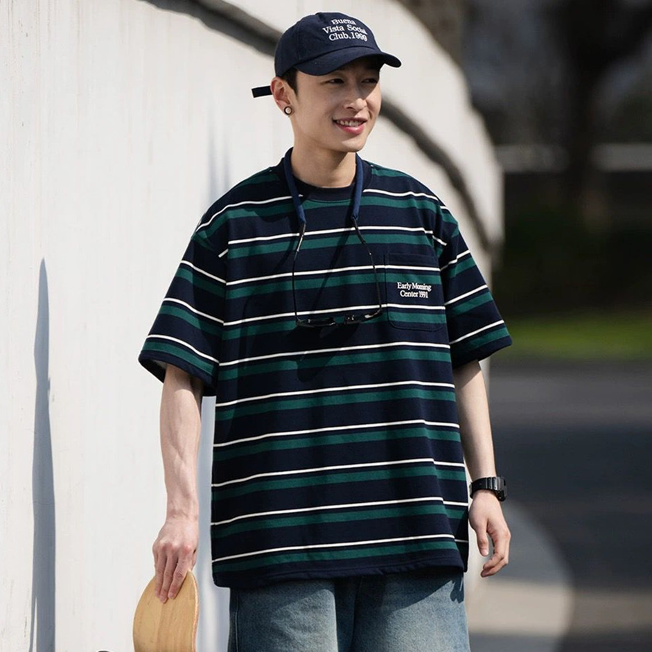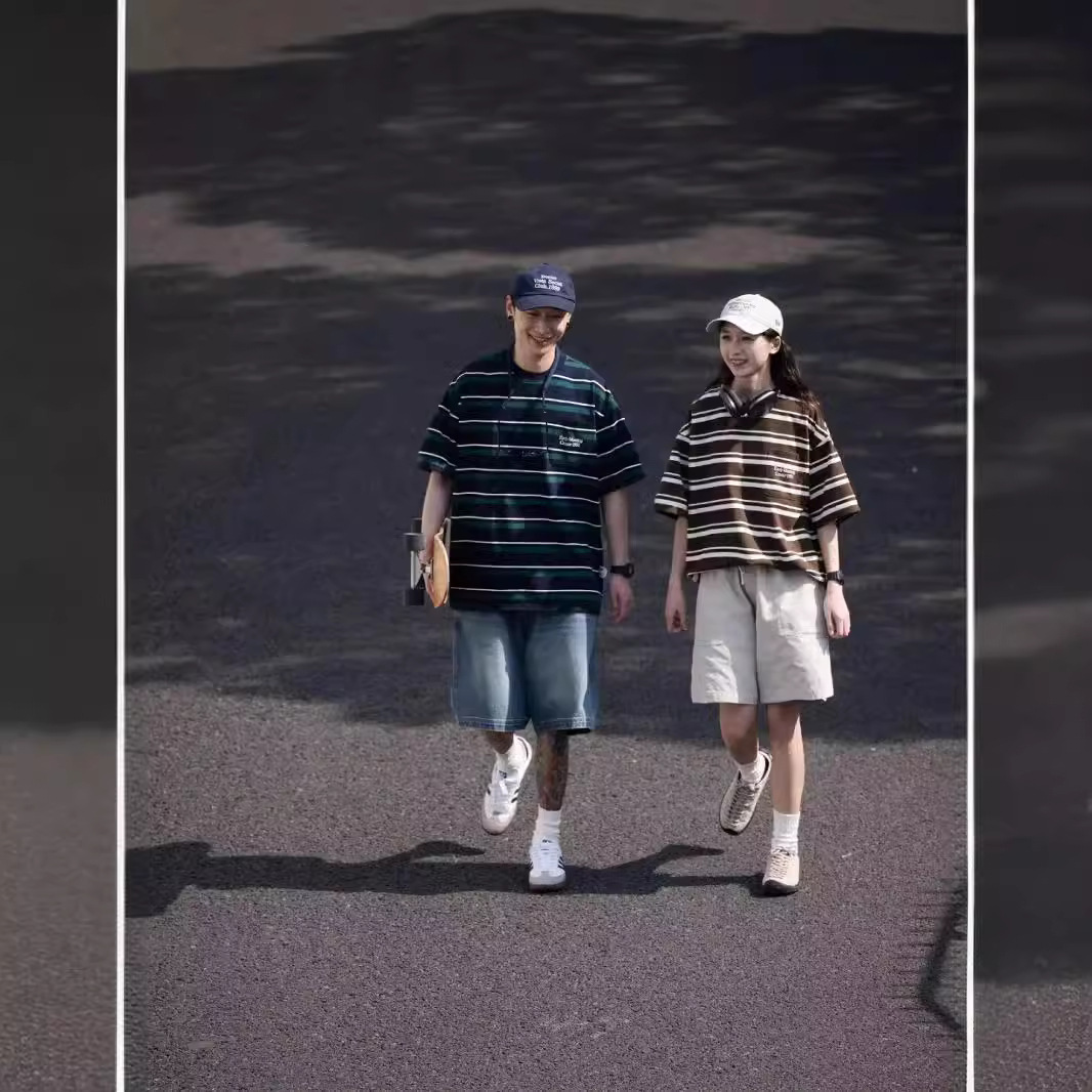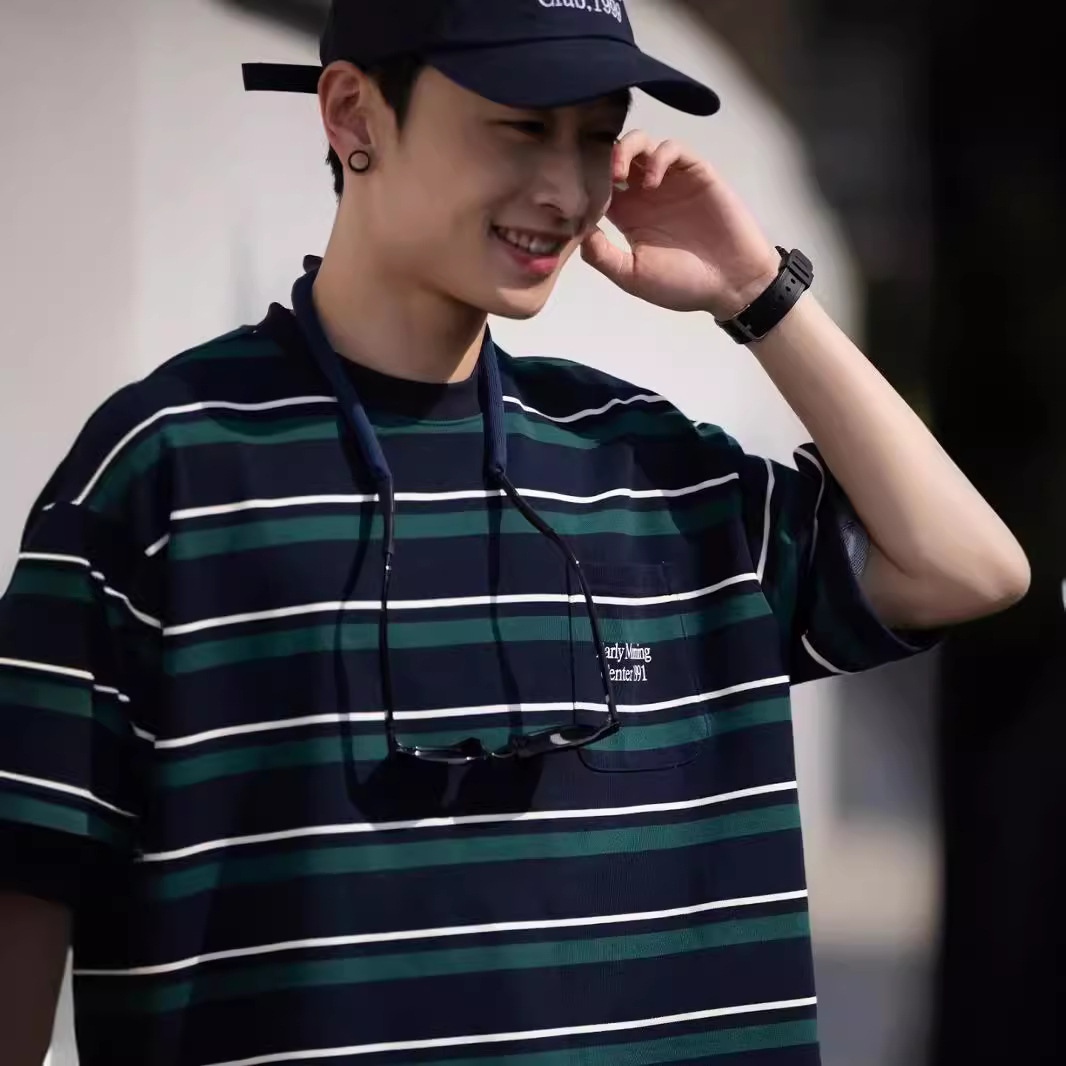 日系復古條紋短袖t恤男夏季潮牌寬松百搭半截袖體恤情侶裝上衣服