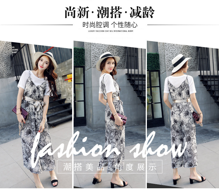 2018夏季時尚闊腿褲女高腰兩件套吊帶系帶寬松顯瘦七分連體套裝實