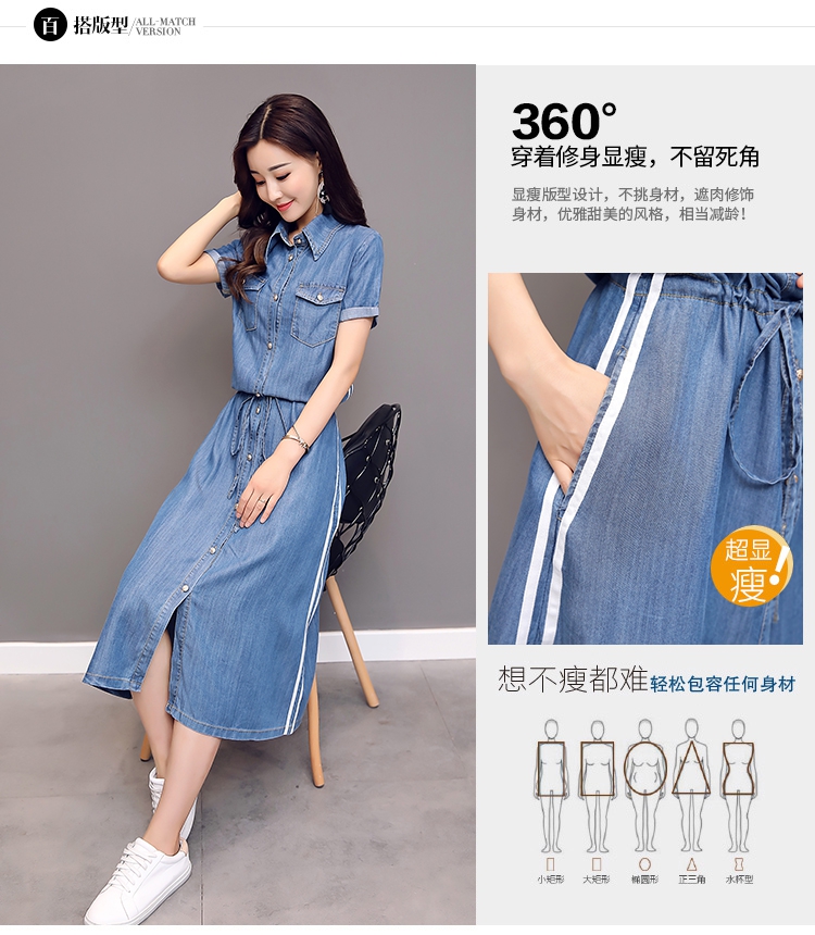 牛仔連衣裙女夏2018新款韓版中長款寬松顯瘦休閑短袖系帶大碼裙子