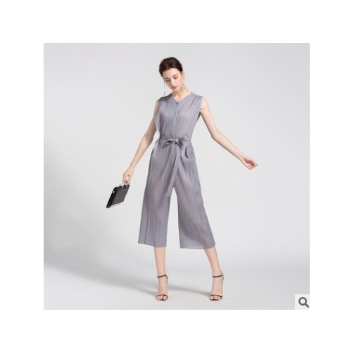 夏季三宅新款高腰褶皺連衣褲純色無袖修身顯瘦氣質(zhì)闊腿連體褲女