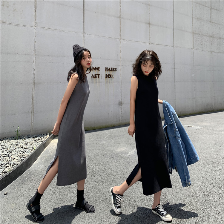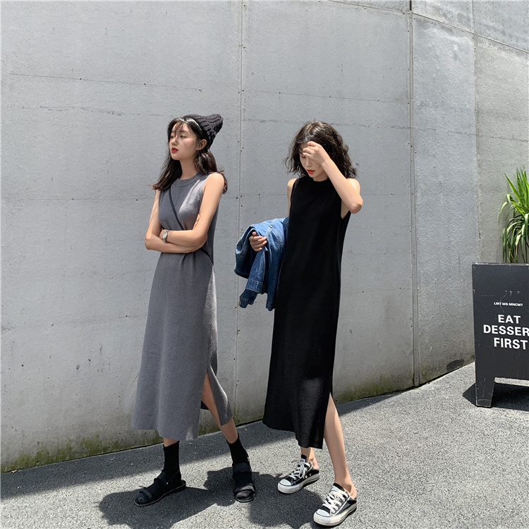 秋冬新款女裝圓領無袖寬松針織背心裙直筒打底裙時尚開叉連衣裙潮