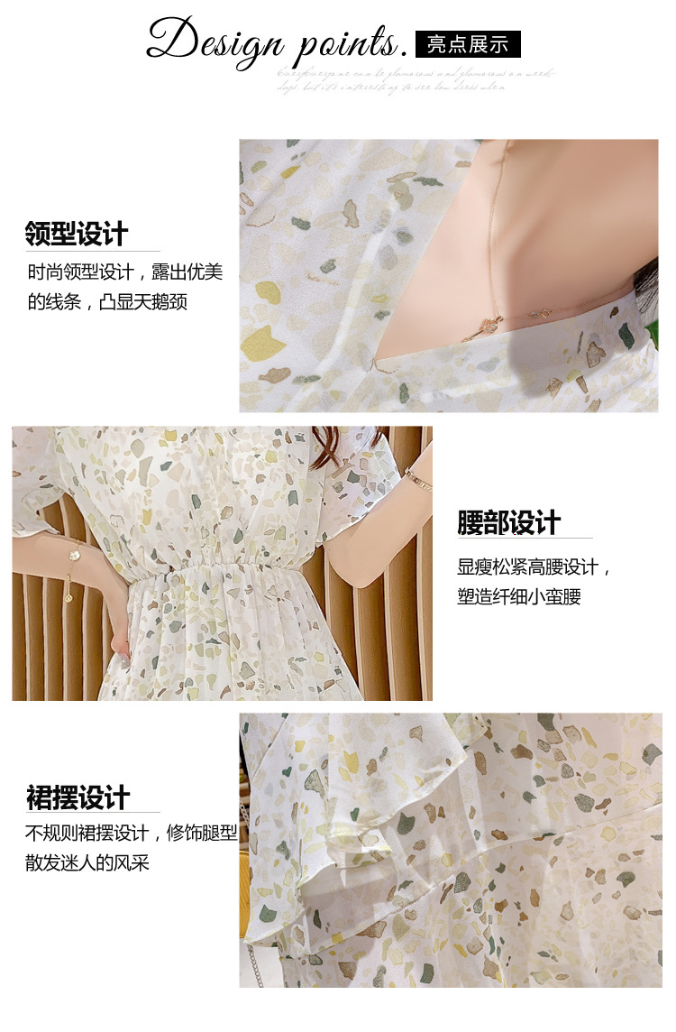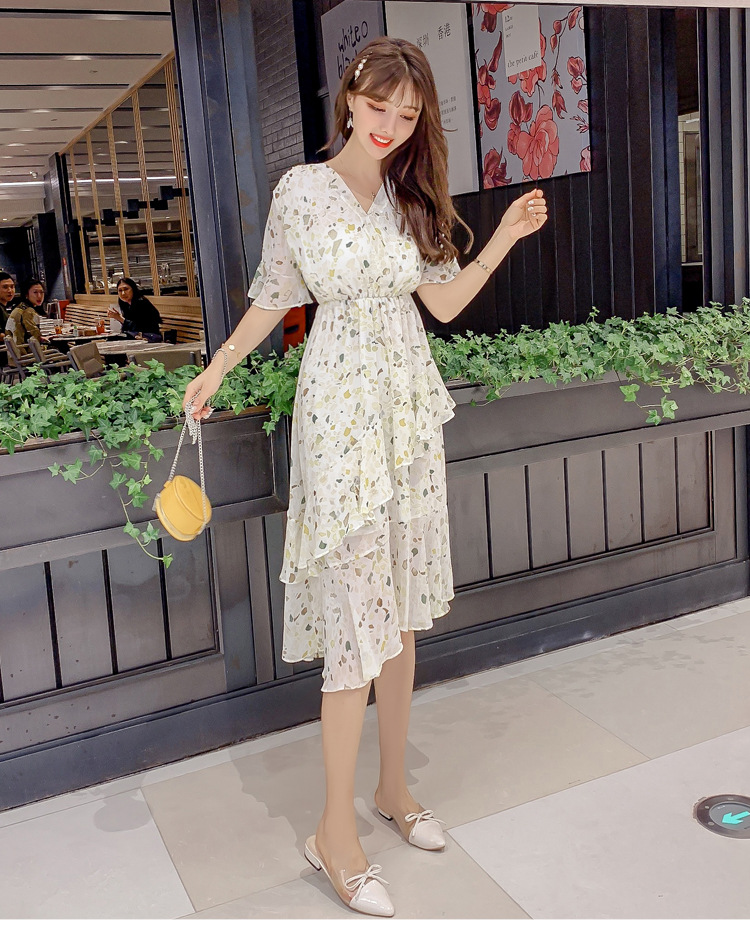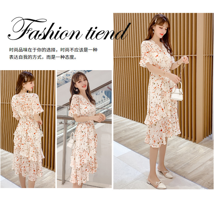 2020夏季新款女裝韓版修身顯瘦V領喇叭袖中長款碎花雪紡連衣裙潮