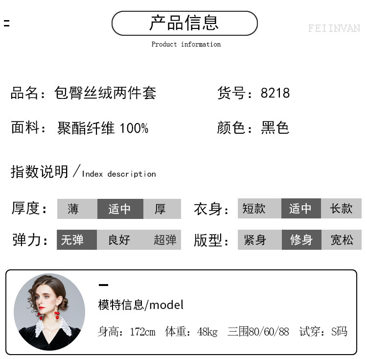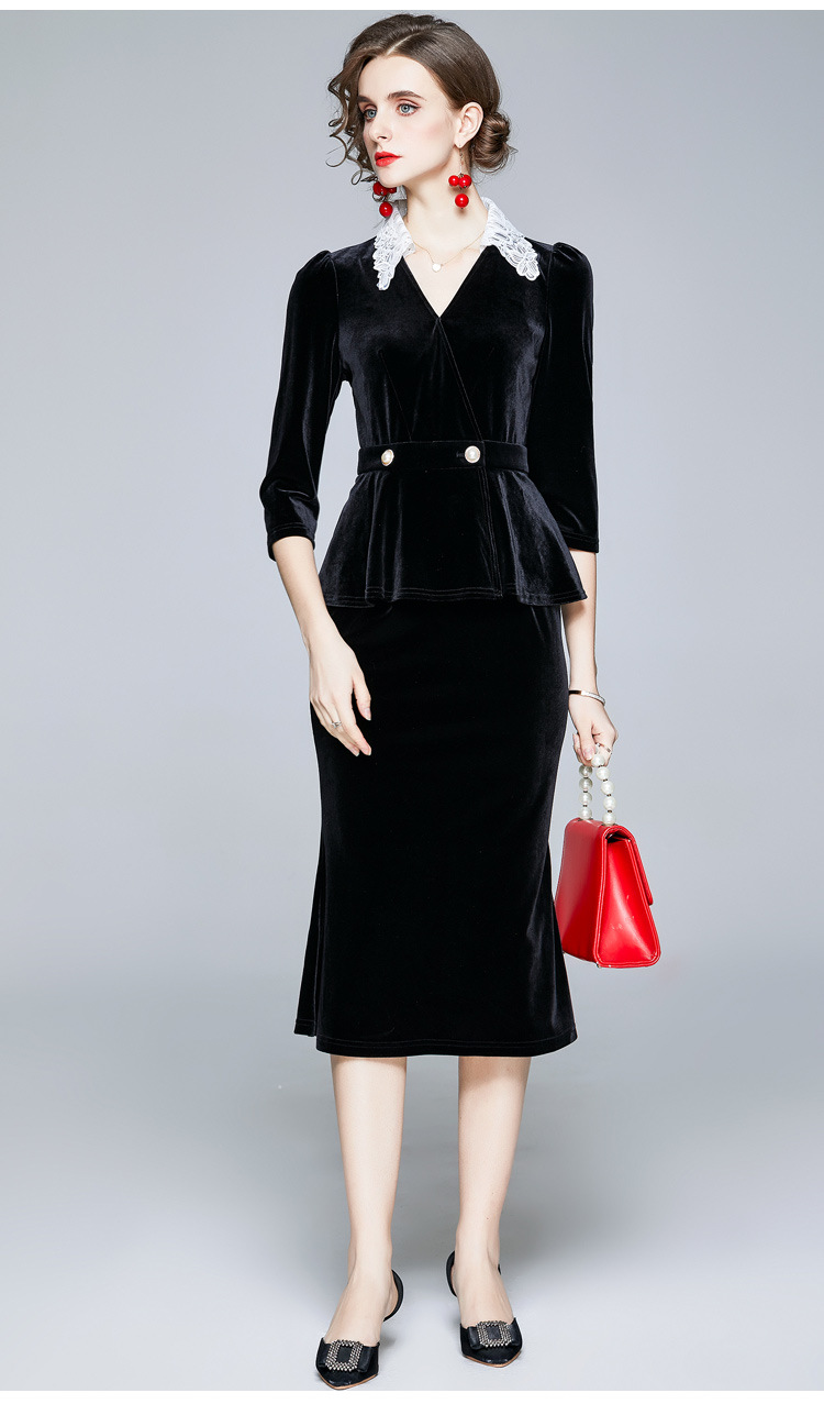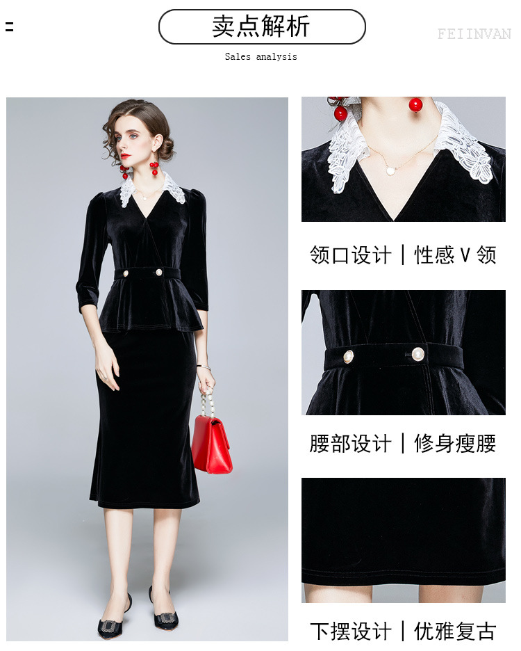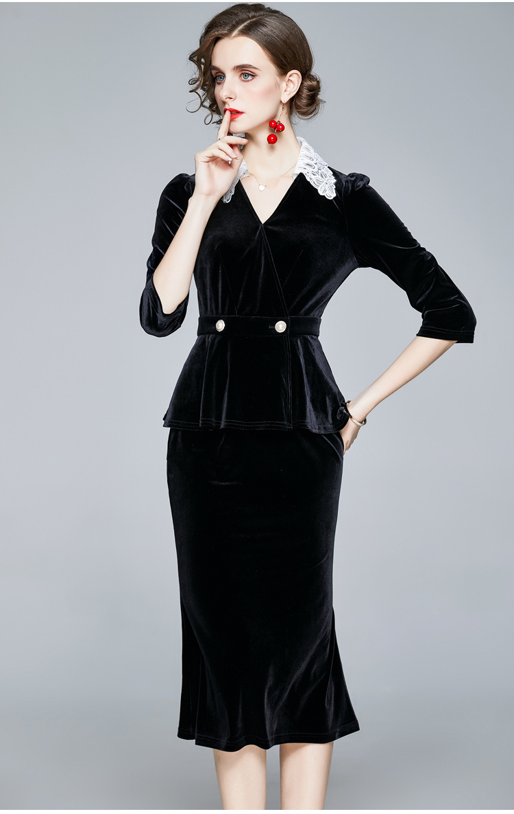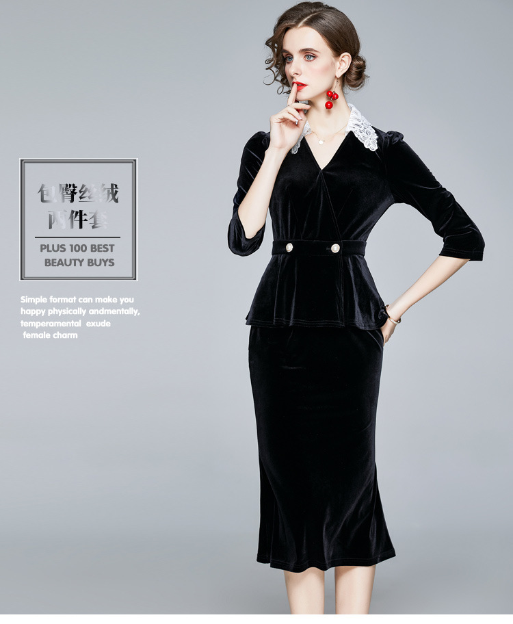 產品: 瀏覽次數:716實拍春秋女裝氣質優雅中長款包臀半身裙+七分袖絲絨兩件套裝裙