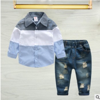 外貿(mào)春款跨境童裝 男童長袖上衣破洞牛仔套裝 兒童春款兩件套批發(fā)