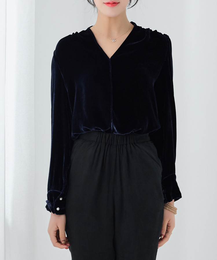廠家批發歐美明星范 柔軟真絲絨V領長袖廓形打底上衣顯瘦襯衫女潮