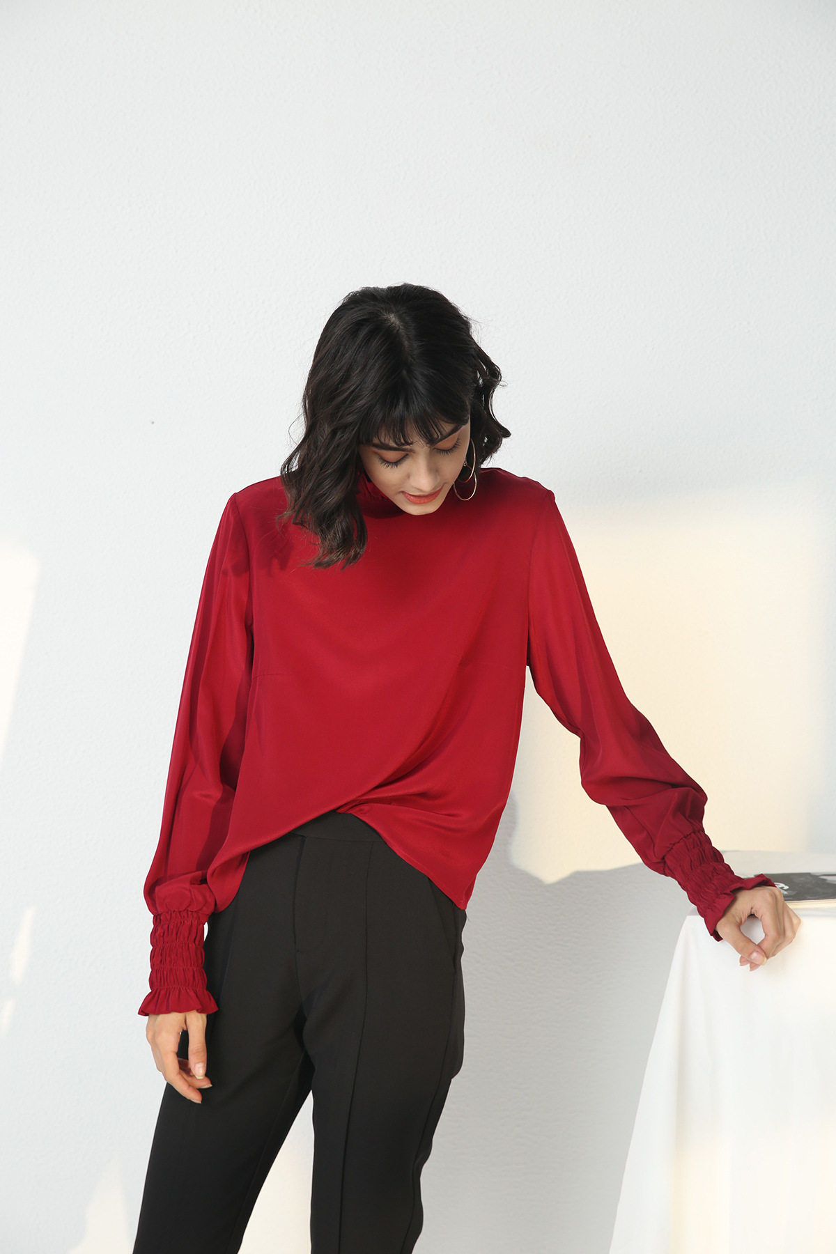 廠家批發 酒紅色米白色荷葉豎領真絲雙縐襯衫上衣女 袖口松緊裝飾