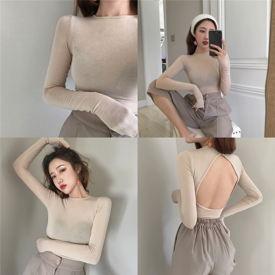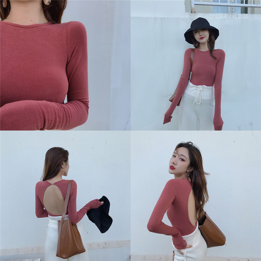初秋新款女純色顯胸長袖打底衫性感緊身T恤純色長袖露上衣476