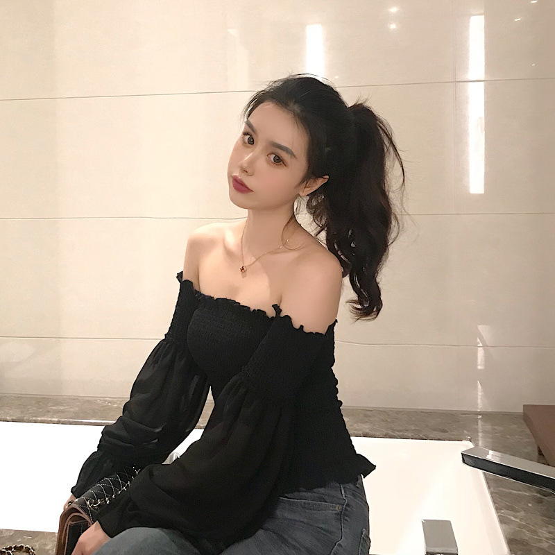 chic韓版一字肩雪紡衫女夏長袖收腰性感小心機上衣 一字領450
