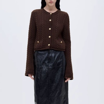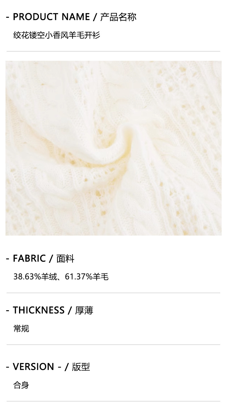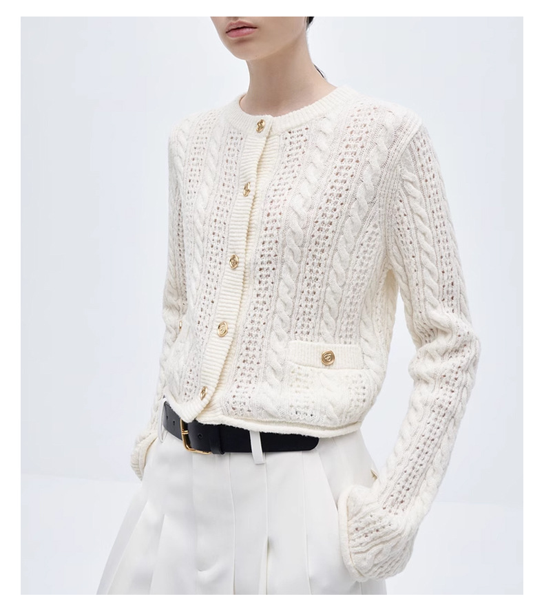 2024冬季款絞花鏤空小香風(fēng)羊毛開(kāi)衫設(shè)計(jì)感時(shí)尚顯瘦純色針織毛衣女