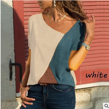 2019速賣通wish新款熱賣拼接撞色圓領短袖休閑T恤女士上衣