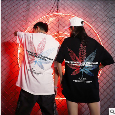 楓葉印花短袖T恤男潮流原宿風(fēng)情侶裝夏裝oversize體恤青年打底衫