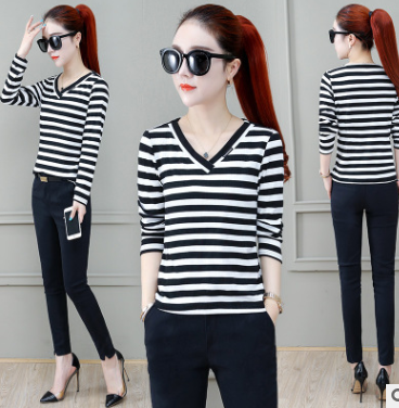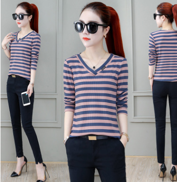2019秋裝新款V領韓版百搭打底衫修身顯瘦條紋長袖T恤女針織衫衣服