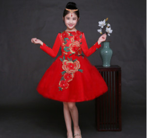 中國風加絨紅色大花兒童禮服公主裙蓬蓬紗裙花童晚禮服秋季演出服