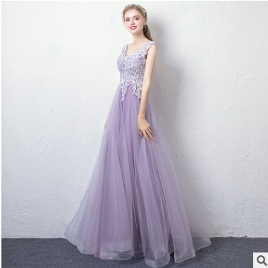 禮服裙女2019新款紫色高貴雙肩V領(lǐng)晚宴長款聚會伴娘主持人晚禮服