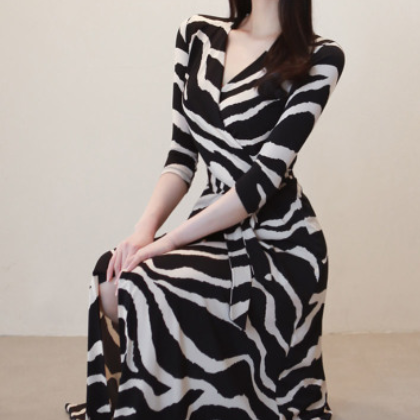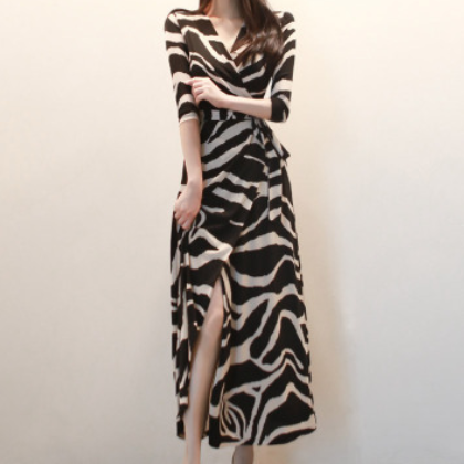 跨境女裝2020春裝新品韓版氣質V領印花顯瘦系帶收腰長裙連衣裙