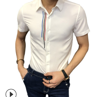 2019潮流夏季中袖襯衫男士五分中袖衣時尚白色韓版休閑修身刺繡花