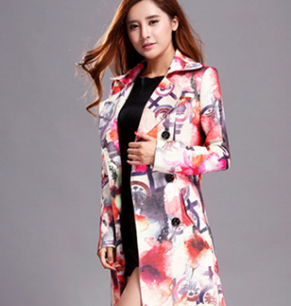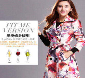 2019新款風衣中長款氣質外套顯瘦 修身印花外套立領