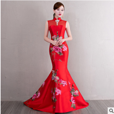 復(fù)古紅色旗袍長款2019新款優(yōu)雅修身性感蕾絲中式旗袍裙宴會晚禮服