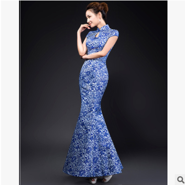 青花瓷袍旗袍魚尾晚禮服長款年會主持人演出服中式復古新娘敬酒服