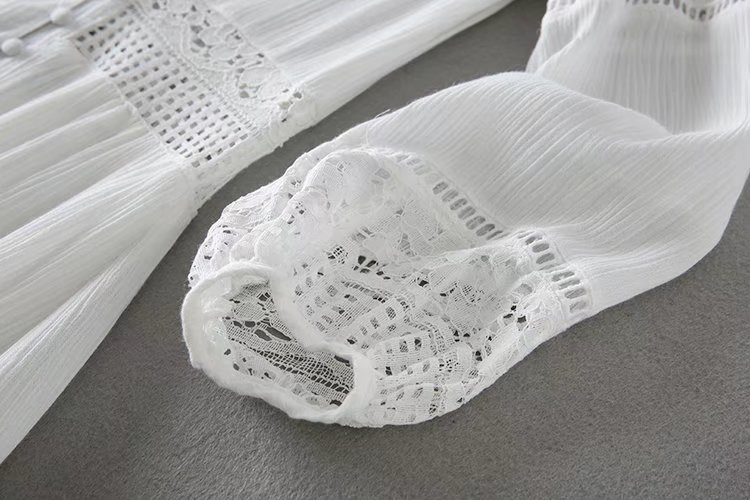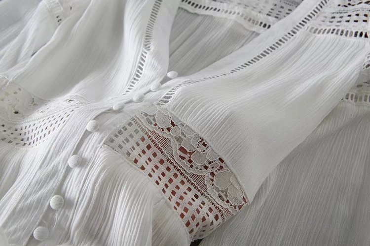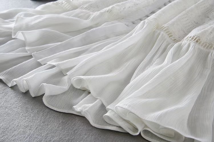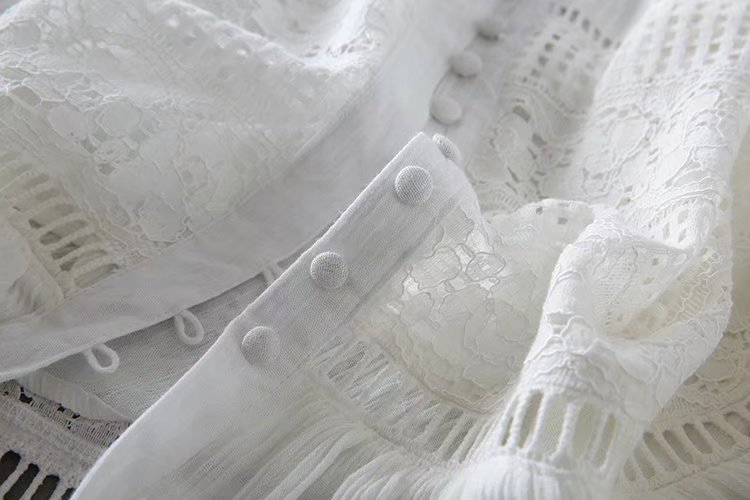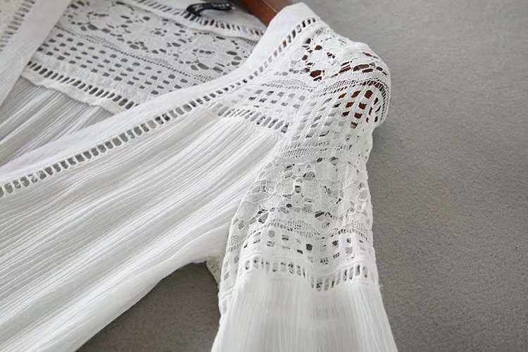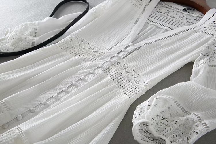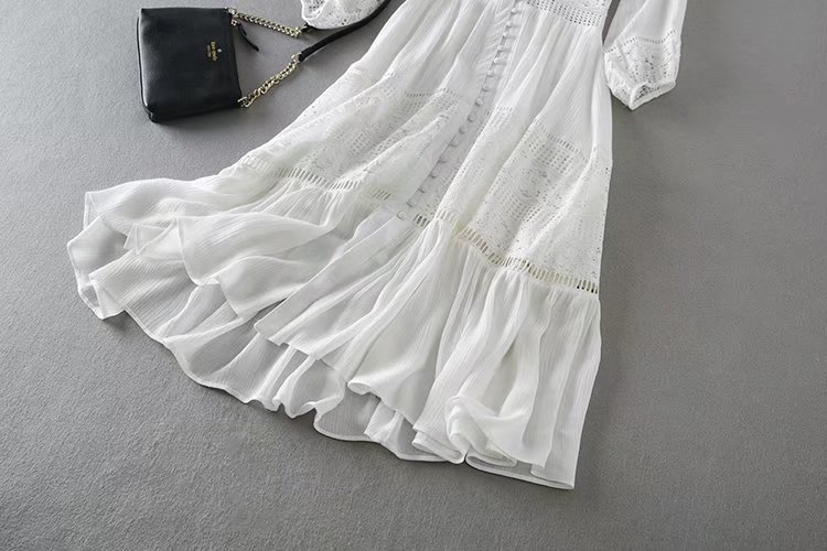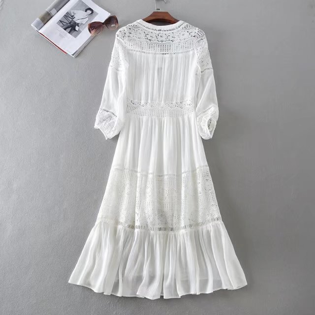 2020歐美風春夏女裝新款批發(fā)白色蕾絲拼接系扣海邊度假蜜月連衣裙