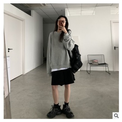 純色休閑學生2020年秋冬季韓版通勤純色寬松型情侶圓領衛衣女ins
