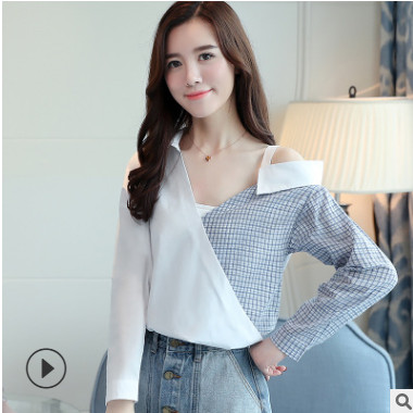 春季女裝新款V領拼接撞色格子長袖露肩襯衫女一件代發(送裹胸)