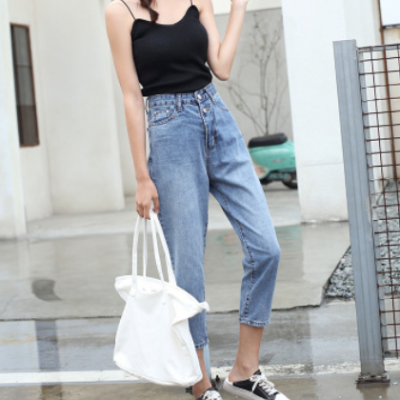 牛仔褲女裝2021年春夏新款韓版高腰寬松顯瘦顯高時(shí)尚老爹八分褲子
