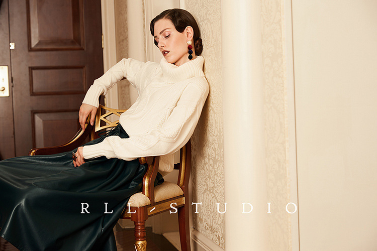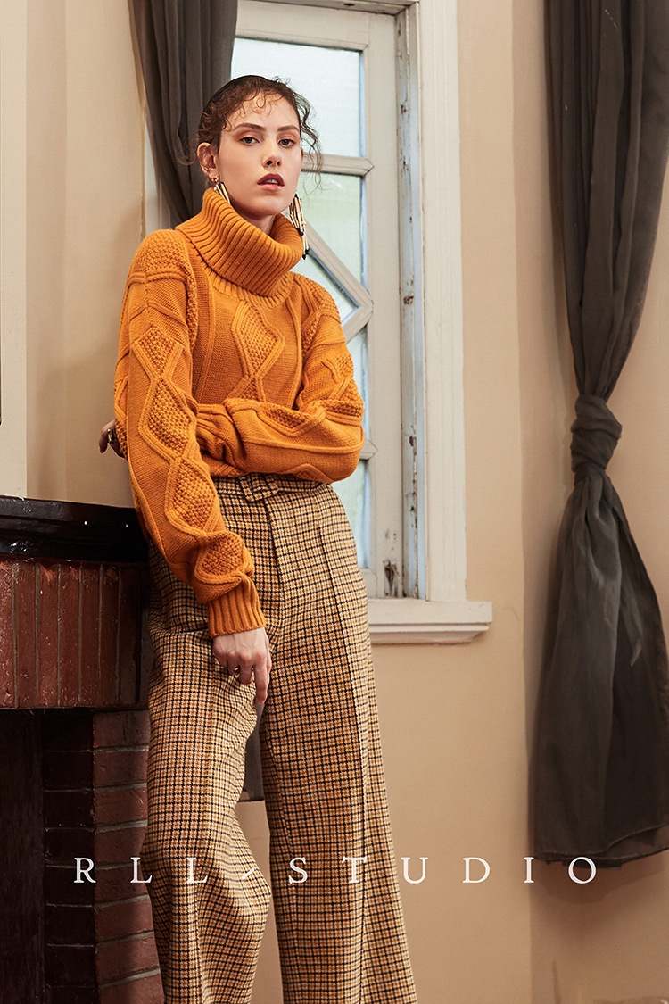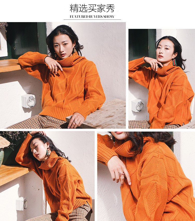 歐美范慵懶風寬松高領毛衣菱形扭花短款落肩袖女羊毛衫加厚針織衫