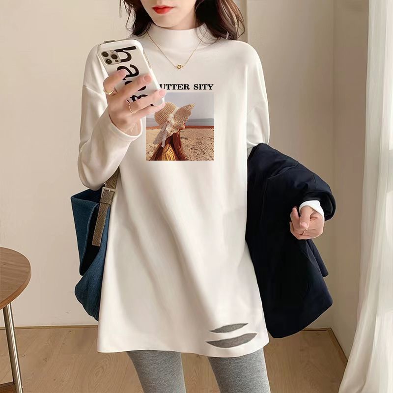 單款/加絨 純棉白色半高領打底衫女秋冬中長款時尚洋氣內搭上衣潮
