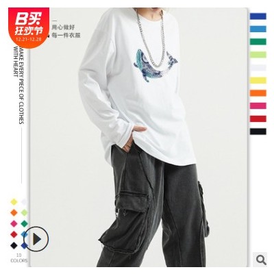 寬松型青少年純色休閑棉無領白色普通長袖秋季t恤