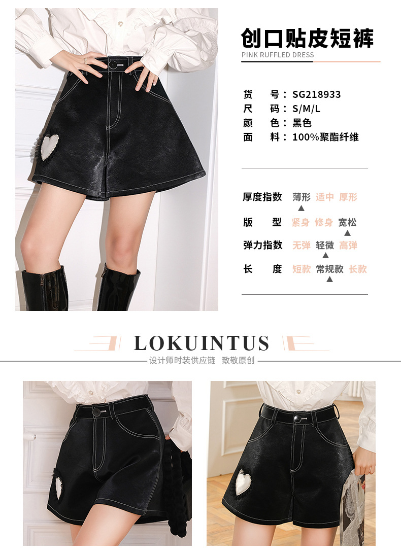 S8933女皮褲春季新款純色蕾絲花邊PU寬松高腰短褲子女顯腿長裙褲