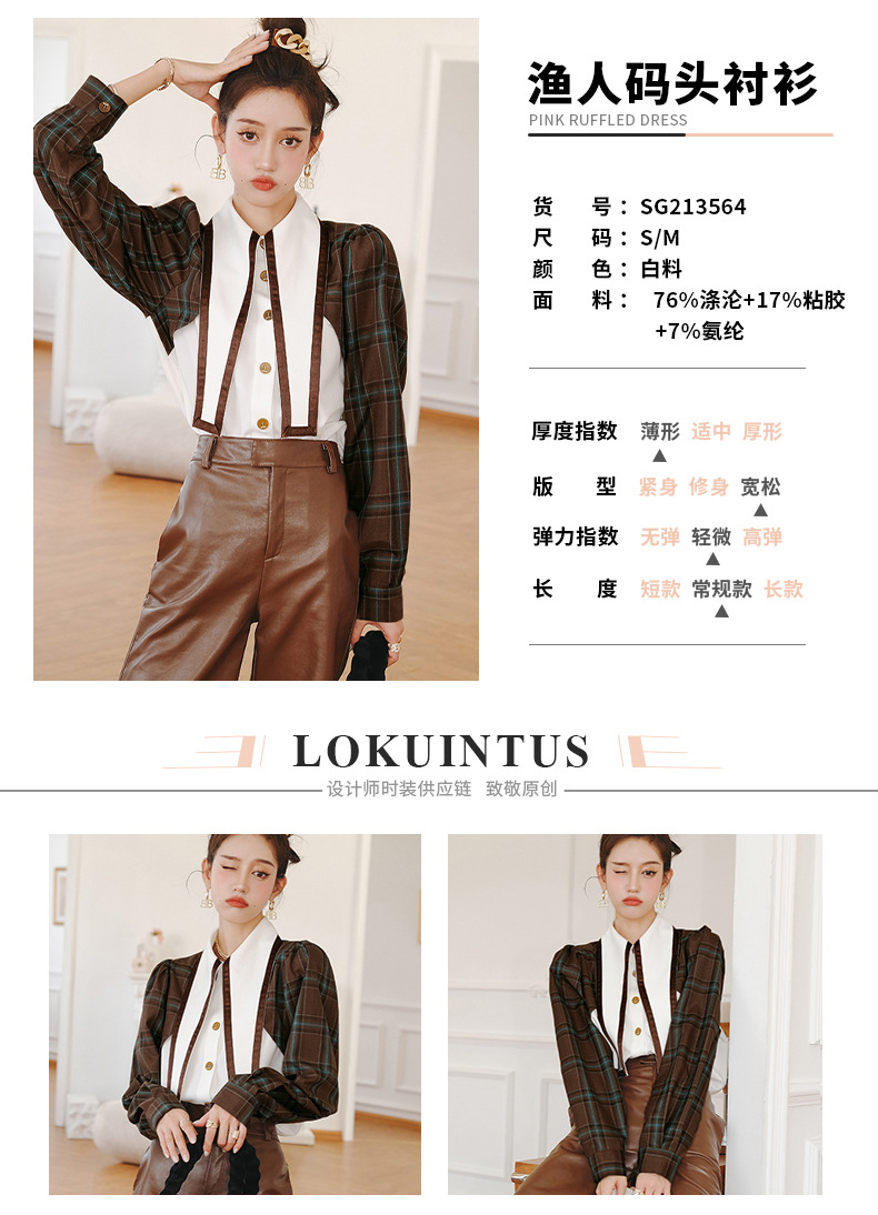 S3608氣質小眾襯衫春季新款格紋尖領長袖單排扣設計感襯衣女寬松