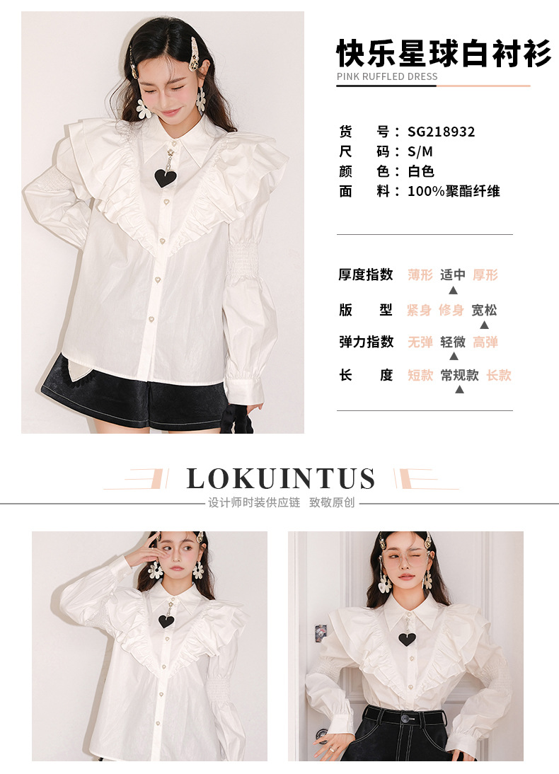 S8932純色氣質(zhì)優(yōu)雅春季新款襯衫木耳邊泡泡袖寬松單排扣白襯衣女