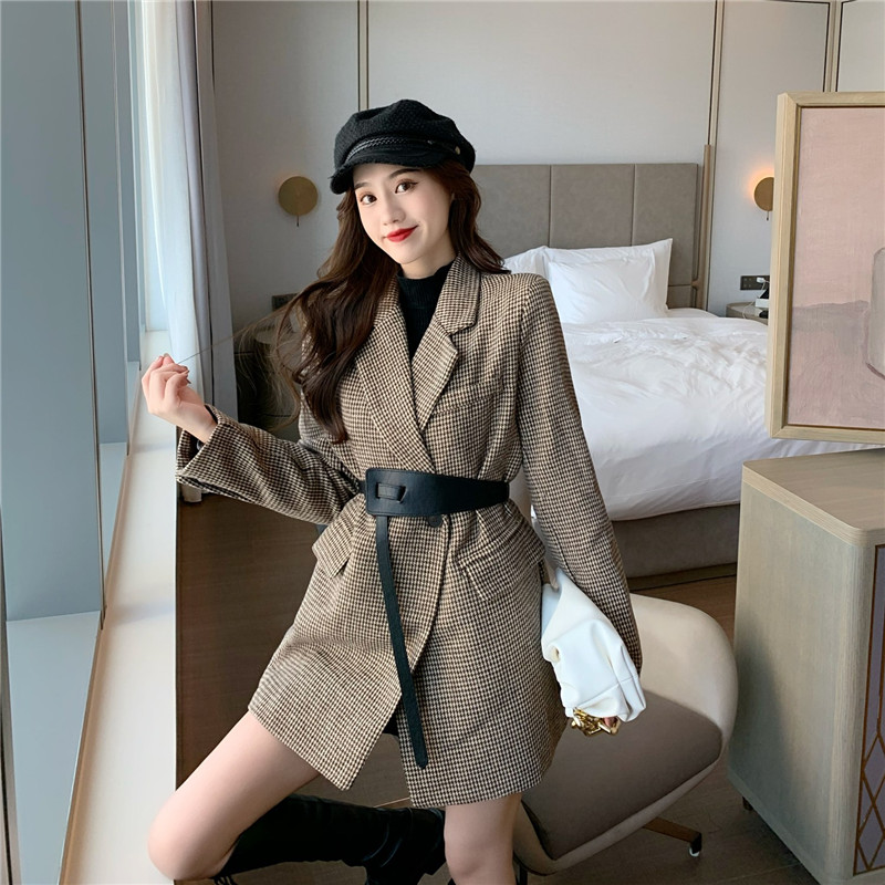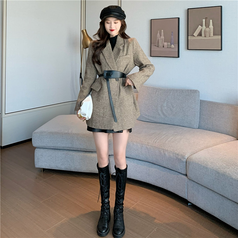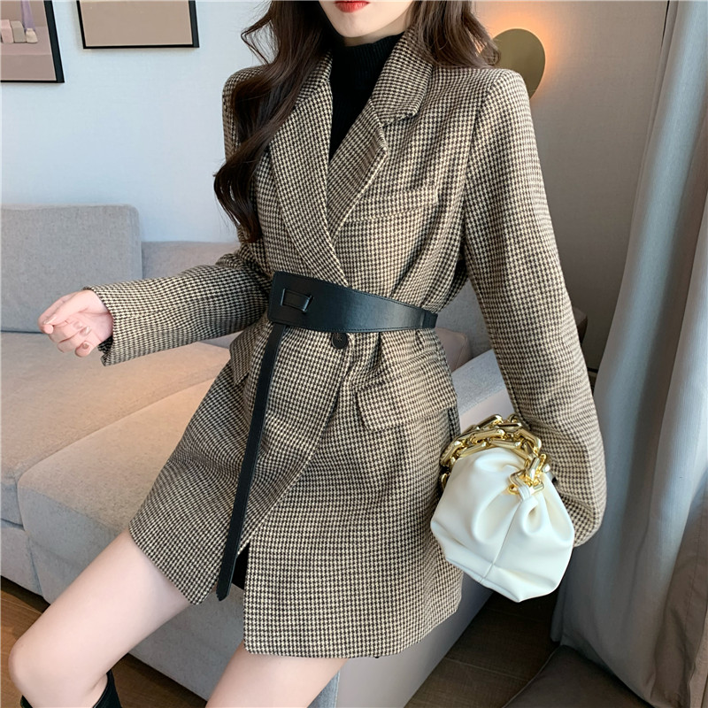 2021春季新款復古西裝收腰氣質中長款小西服毛呢外套上衣女裝