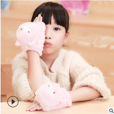 2019年新韓款冬季卡通可愛毛絨手套女 加厚保暖翻蓋半指女士手套