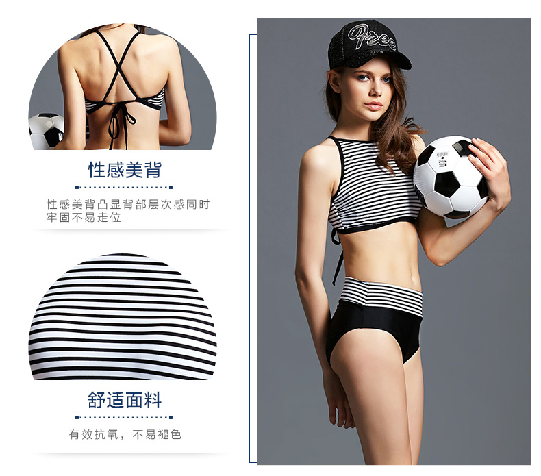 波尼士女新款時尚經典黑白條紋舒適性感三角分體泳衣兩件套