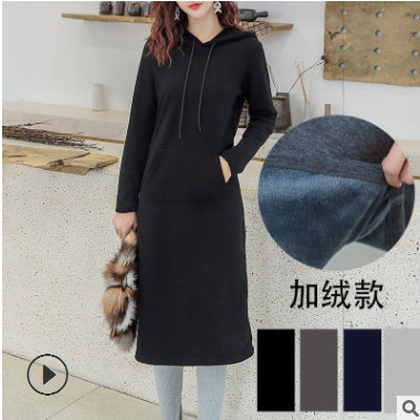 跨境爆款冬季加絨連帽連衣裙口袋插灰袋鼠裙寬松款套頭女衛衣長款