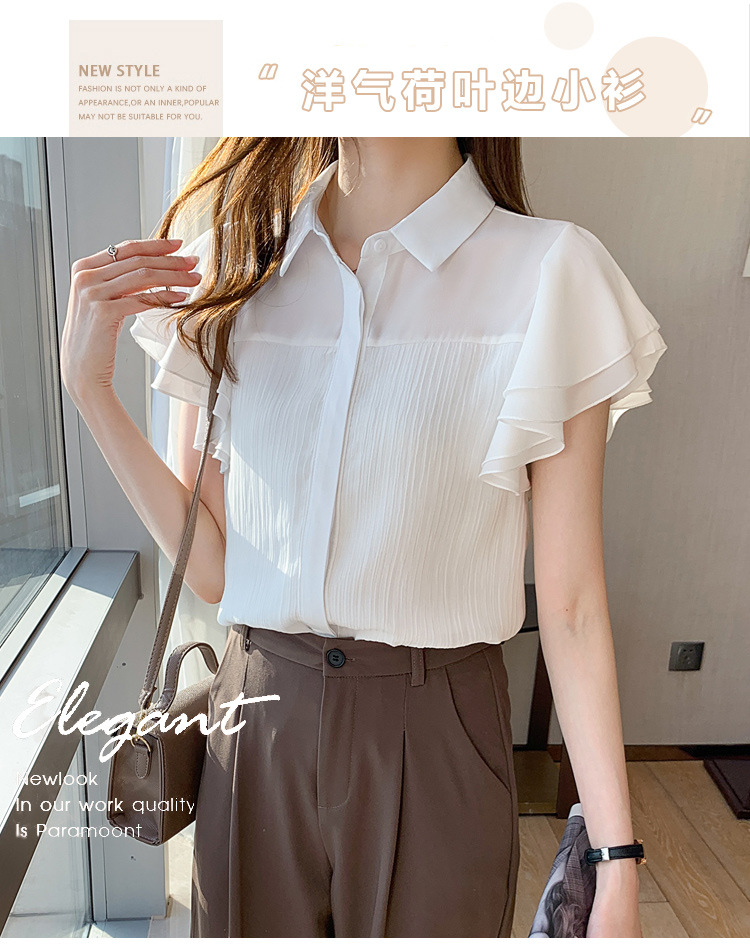 實拍2021夏季新款時尚翻領氣質時尚條紋雪紡襯衫薄款短袖白色襯衣