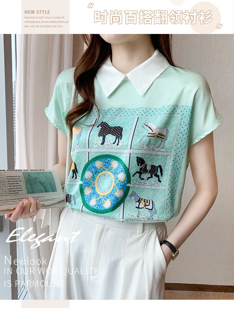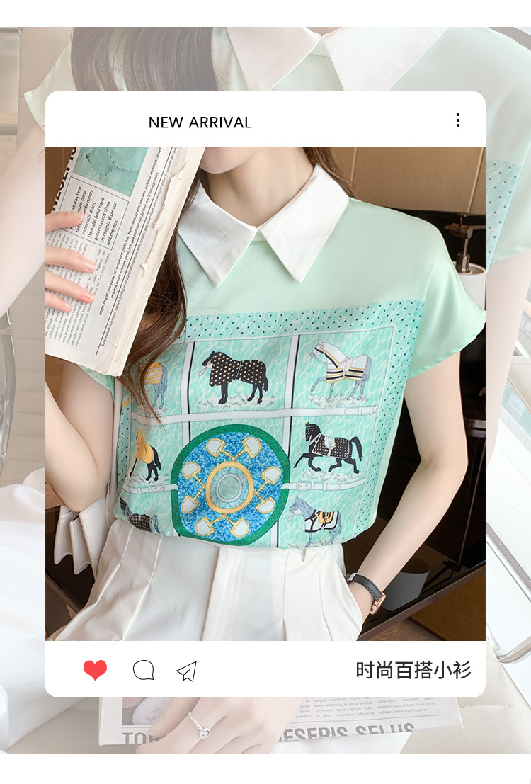 2021年夏季新款時尚百搭翻領上衣設計感印花上衣女