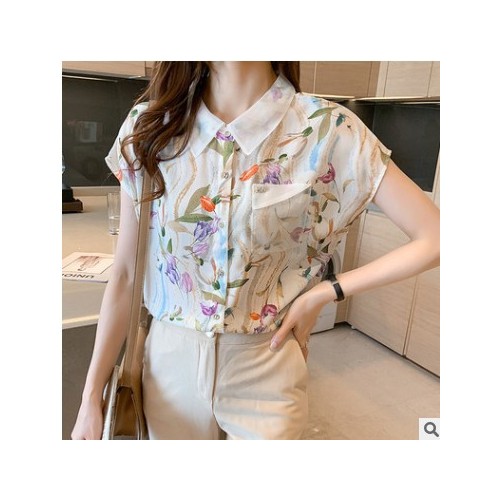 2021夏季新款短袖百搭翻領(lǐng)碎花女上衣洋氣遮肚子寬松襯衫