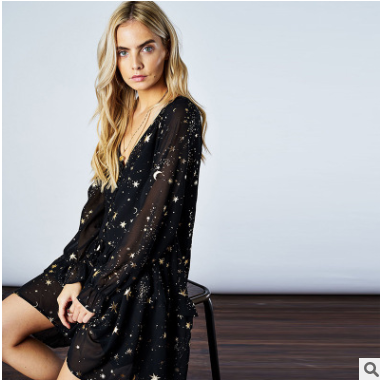 歐美時尚簡約休閑燙金星星印花荷葉邊寬松連衣裙亞馬遜熱賣2019