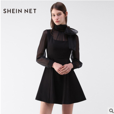 sheinnet批發時尚簡約甜美學院風網紗拼接系帶透視假兩件式連衣裙