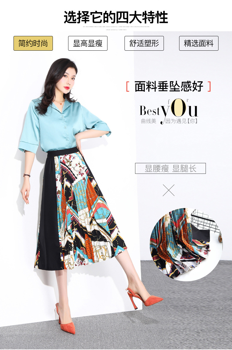2020春季新款復(fù)古印花a字裙中長款顯瘦百褶裙松緊腰裙子大擺長裙