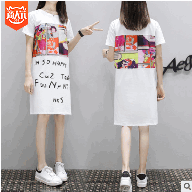 2019夏季新薄全棉印花T圓領(lǐng)上衣女裝韓版寬松大碼中長款短袖t恤女
