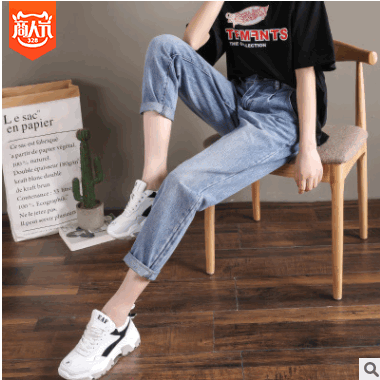 四季新款女式老爹牛仔褲女士哈倫褲女裝韓版寬松顯瘦蘿卜九分褲女
