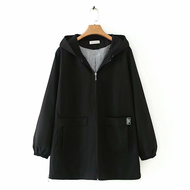 B1大碼女裝2019秋裝新款胖MM顯瘦中長款連帽風衣19048