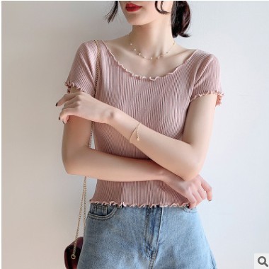 產品: 瀏覽次數:6289針織冰絲短袖t恤女2020夏季新款修身荷葉領木耳邊高腰短款上衣