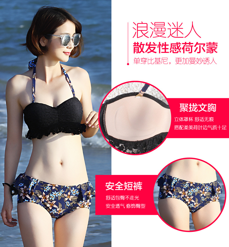 溫泉比基尼黑色性感荷葉邊小胸聚攏保守遮肚比基尼罩衫三件套